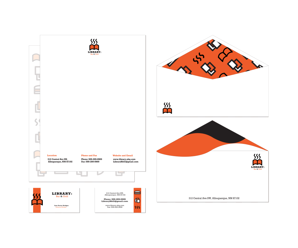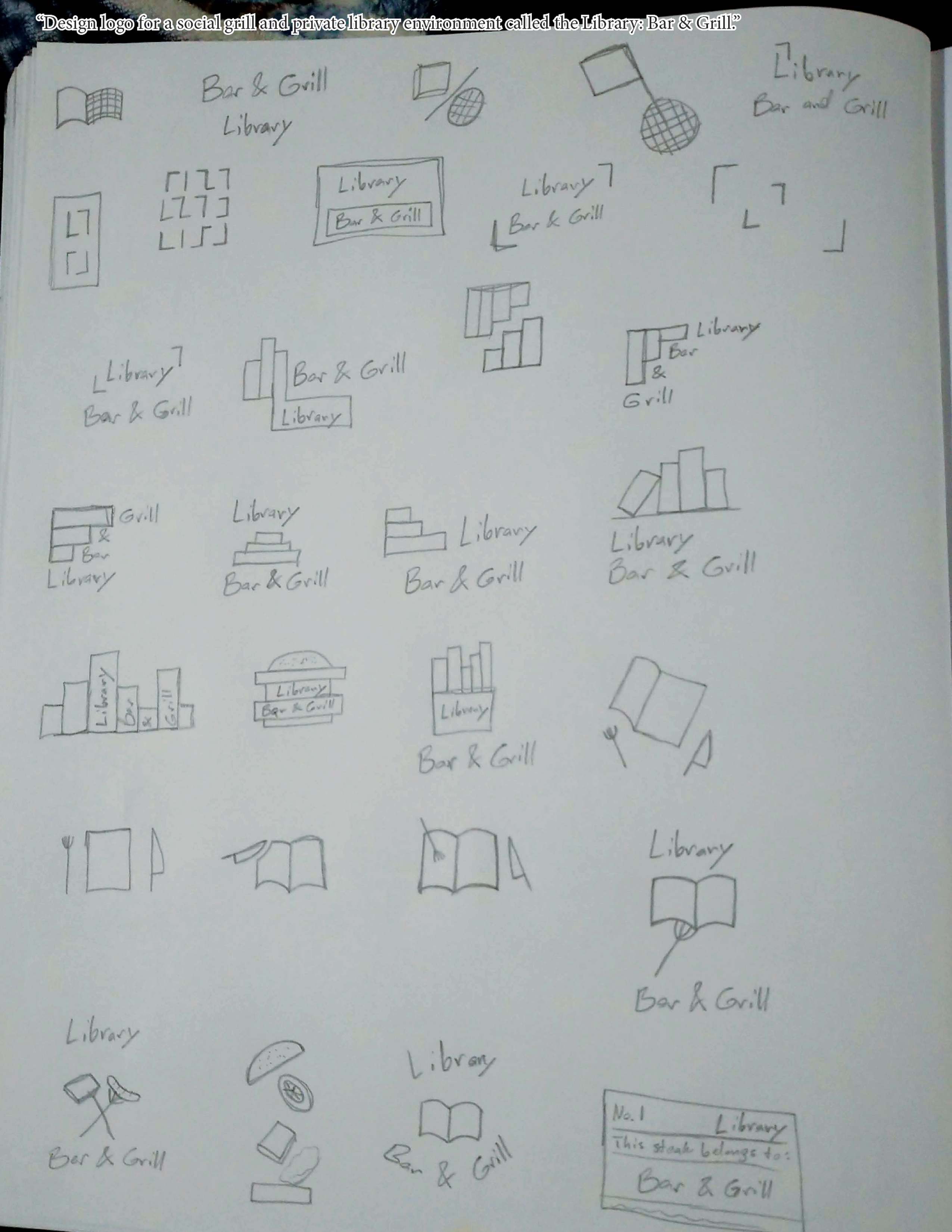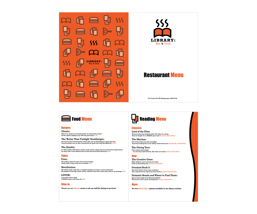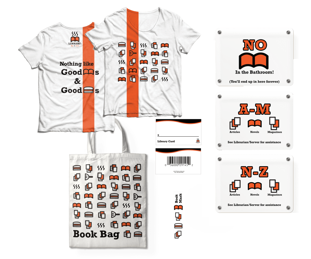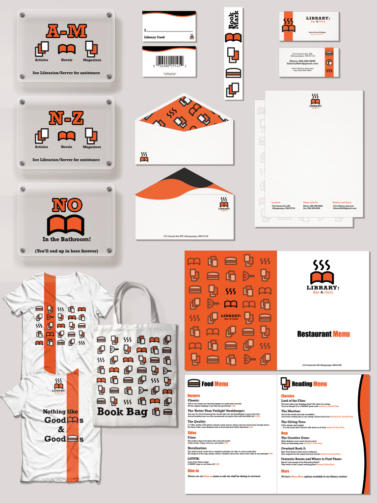 The goal was to create the branding of a made-up restaurant of our choosing. The place I came up with is a library restaurant that divides into two distinct sections: solo eatery for quiet reading, as well as a group setting for book clubs.